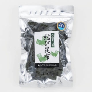 宮城県・石巻のマルイチ西條水産が手がける「塩蔵結び昆布」は、地元・十三浜で採れた促成昆布を湯通しして塩蔵し、1個ずつ手結びで仕上げた手仕事の製品です。