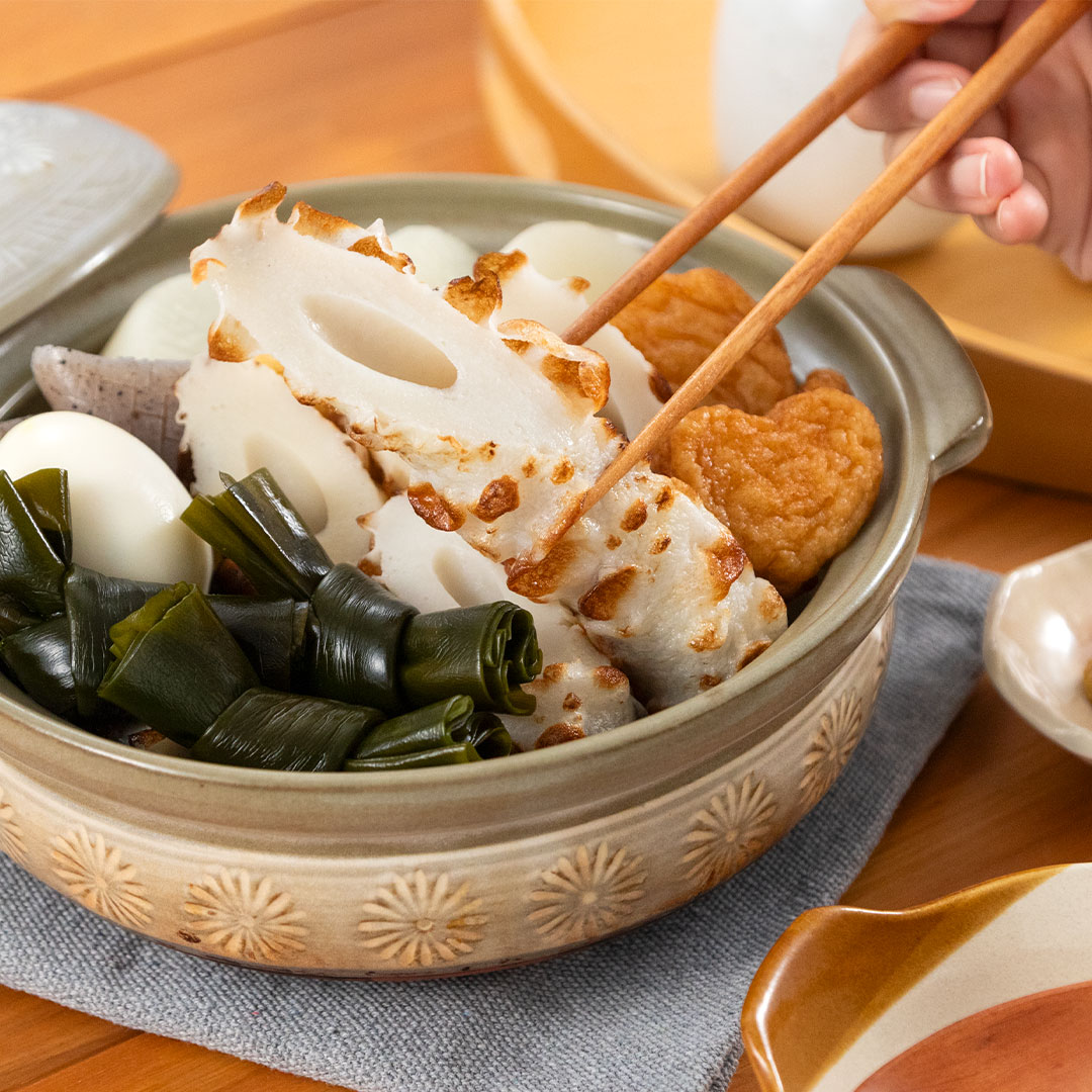 昆布そのものに厚みがあり、しっかりとした噛みごたえがあるのが特長。おでんで長時間煮込んでも煮崩れせず、煮汁をしっかり含ませながらも力強い食感が残ります。やや小ぶりで扱いやすく、定番のおでんだけでなく、小鉢や煮物にも幅広く活用可能。見た目の“ひと手間感”も出せるため、提供価値の高い一品です。